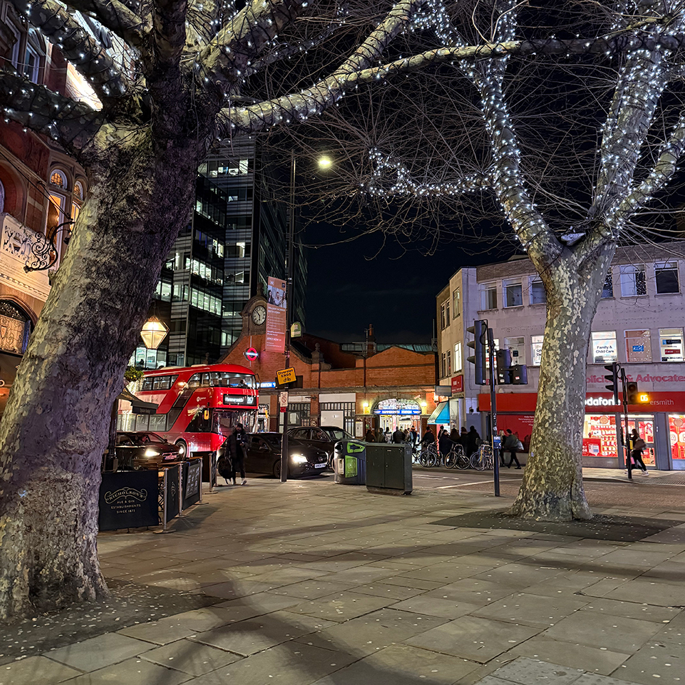 ハマースミス駅前がなんだかクリスマスのイルミネーションのようで、