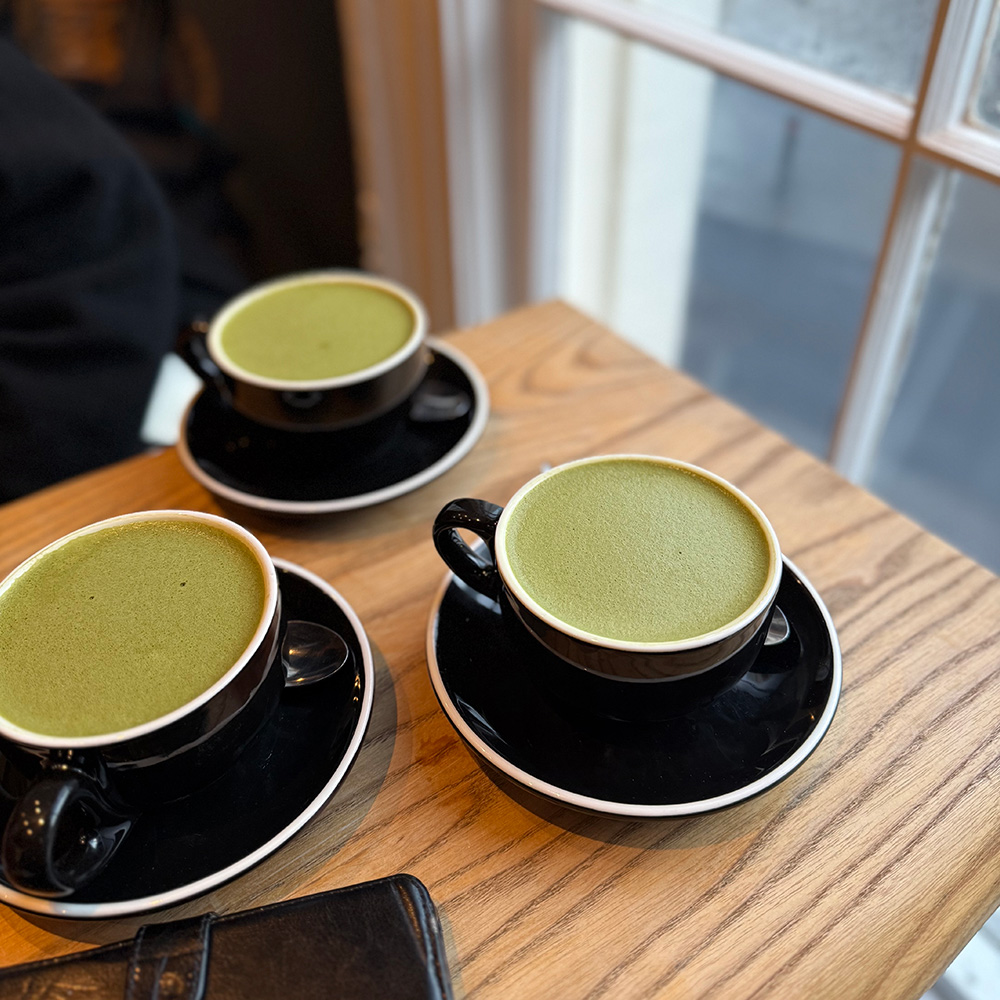 泡立ちの良い抹茶ラテを飲んだ彼の髭は、うっすら緑色に。