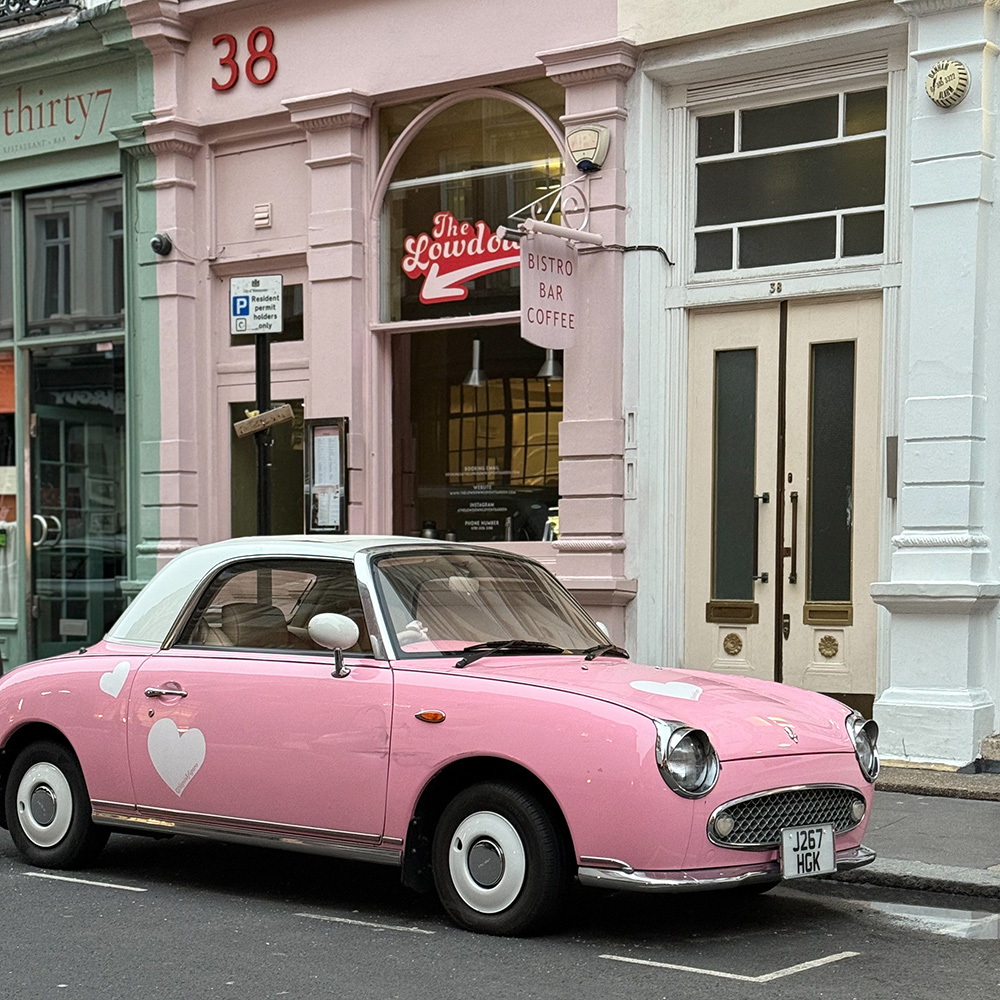 歩いているとピンクのお店の前にピンクのフィガロ!