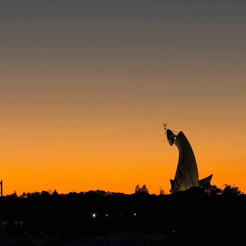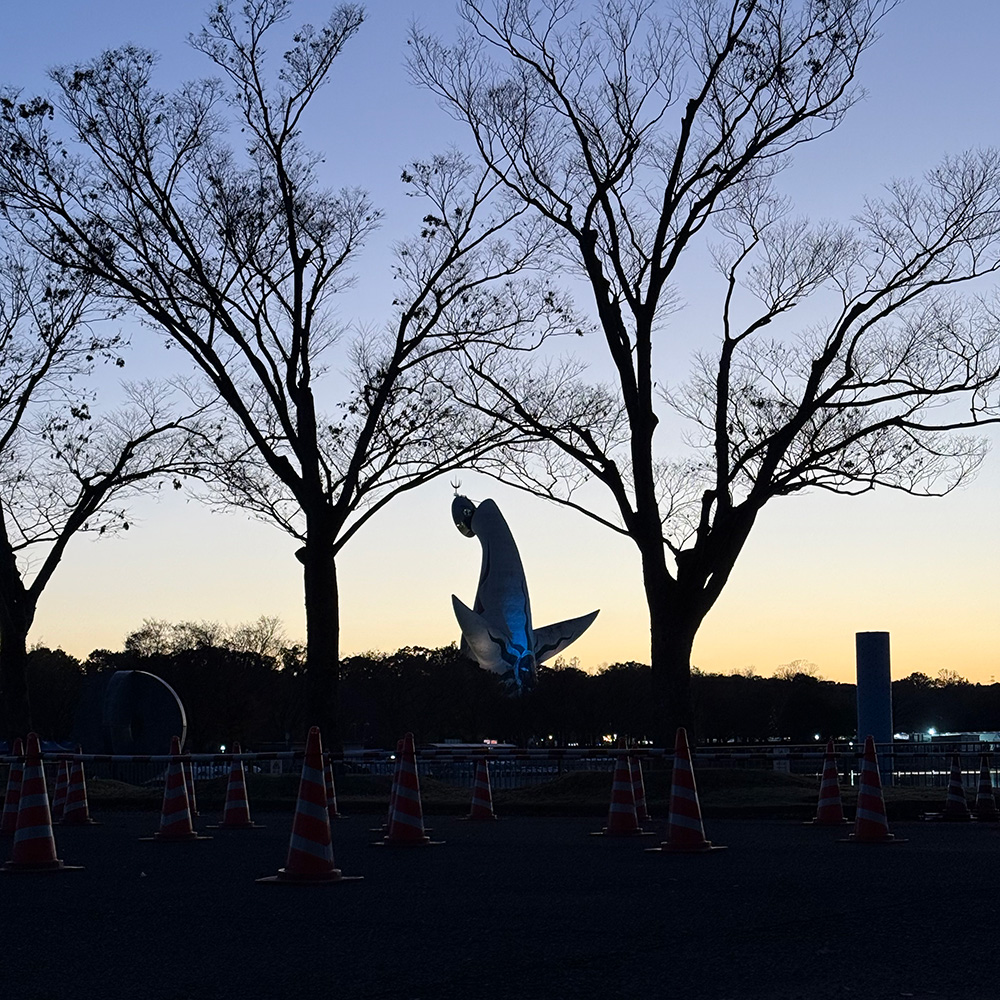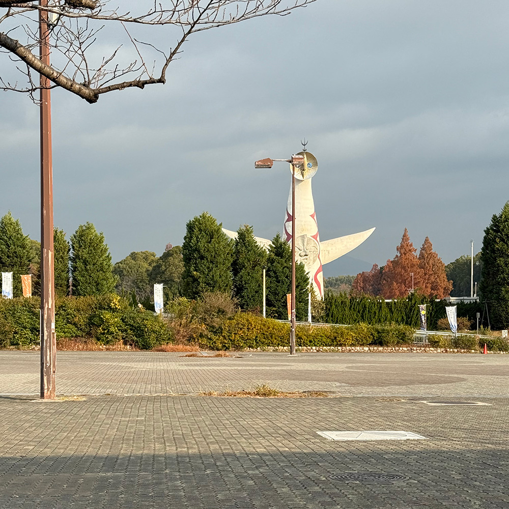 設営の合間に少し休憩。そんなときに見た、斜め後ろ姿の太陽の塔。