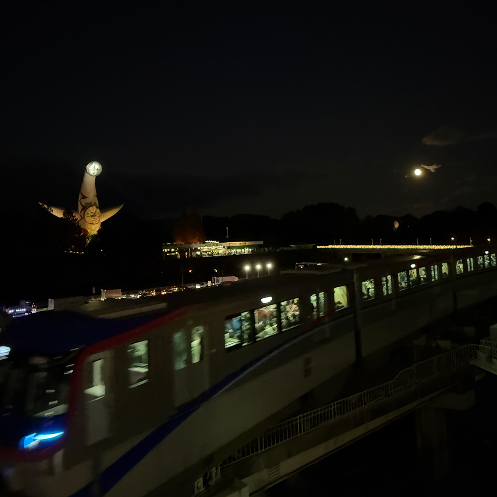 太陽の塔+今年最後の満月。そこへモノレール到着の図。